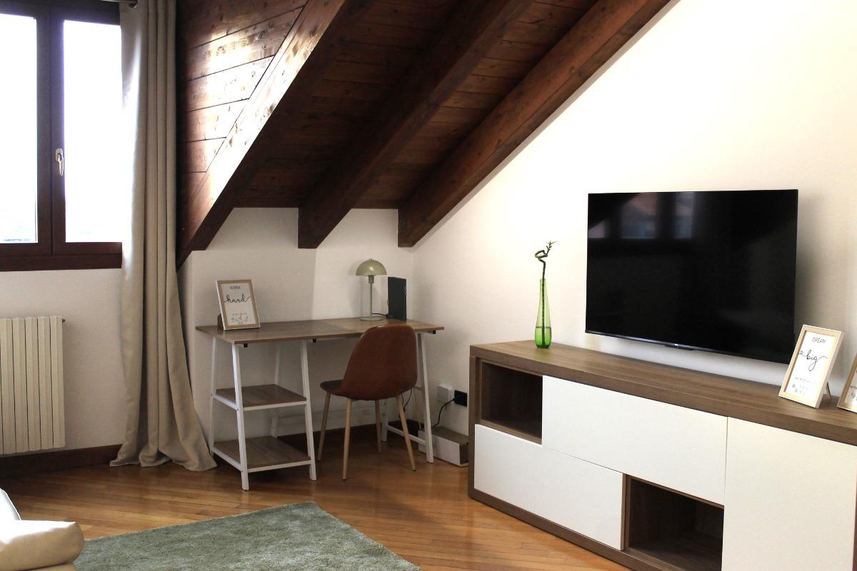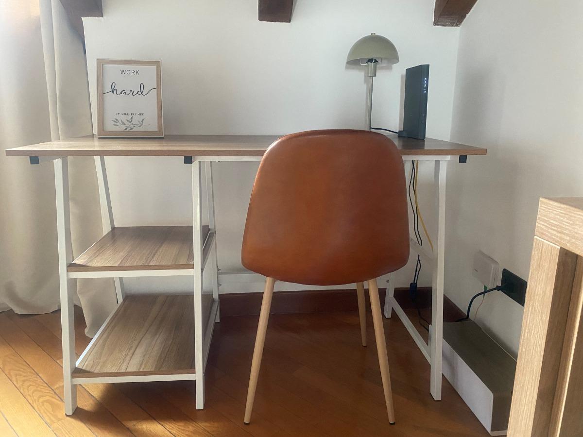 La mansarda è dotata di tutti i comfort: cucina completa di elettrodomestici (piano a induzione, forno tradizionale e microonde, macchina del caffè, tostapane e bollitore), due Smart-TV da 50 pollici, aria condizionata canalizzata, riscaldamento autonomo e connessione Wi-Fi fibra ad alta velocità con postazione dedicata per lo smart working.